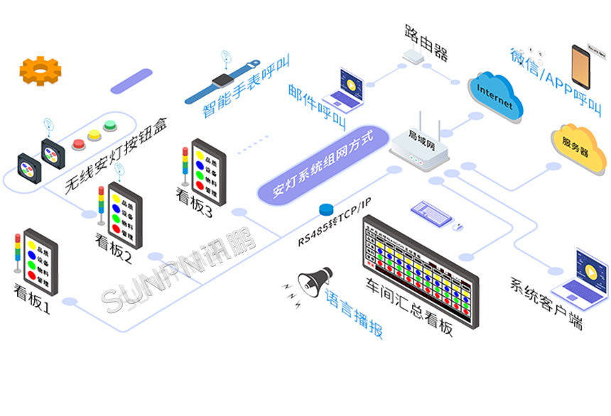 1、安灯系统组网方式:通过需求的通讯方式来实现系统组网,由局域网连接到各个硬件,实现数据实时传输。