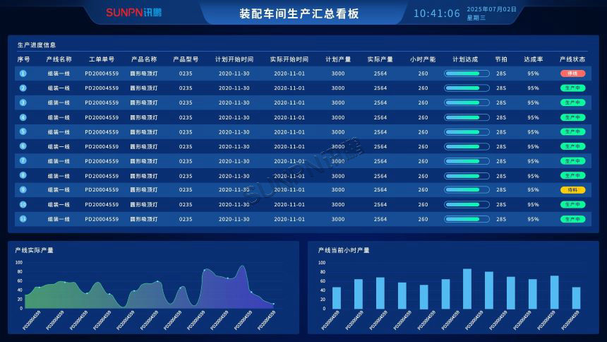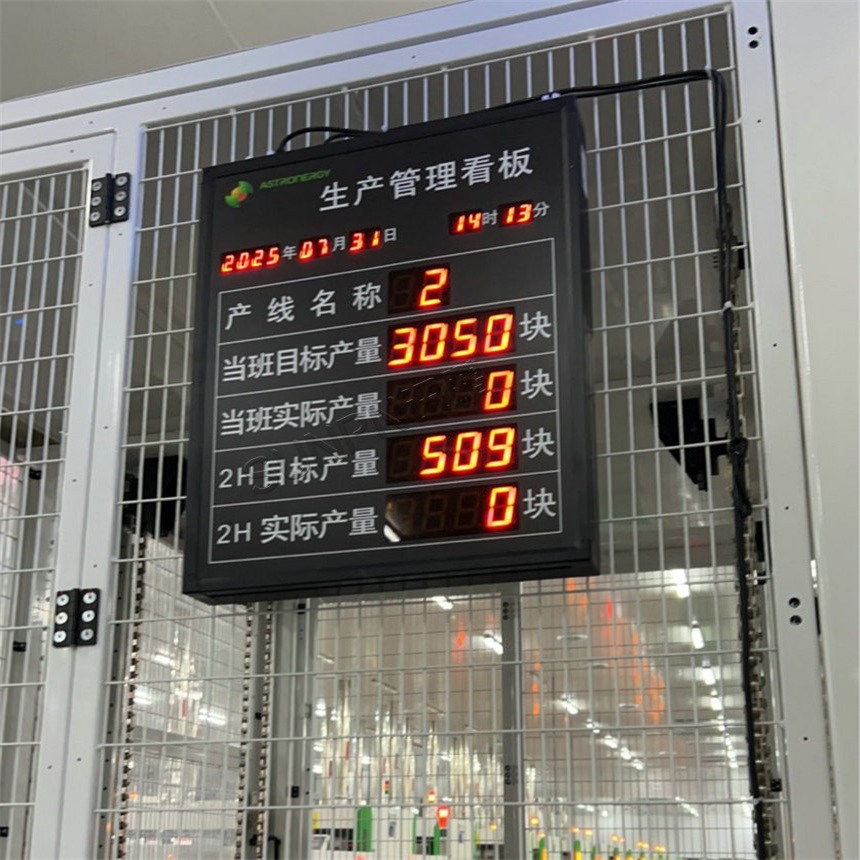 讯鹏科技为其部署的LED电子看板系统,作为产线信息的集中呈现枢纽,安装于车间关键工段上方。看板高效集成MES及订单管理系统,实时展示包括产线名称、当班生产计划(目标产量)、当前实际产量、以2小时为单位的时段目标及完成量等关键数据。