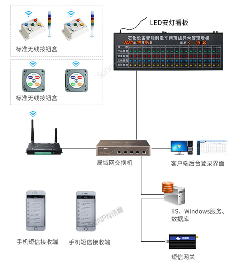 1、安灯系统组网方式:通过需求的通讯方式来实现系统组网,由局域网连接到各个硬件,实现数据实时传输。