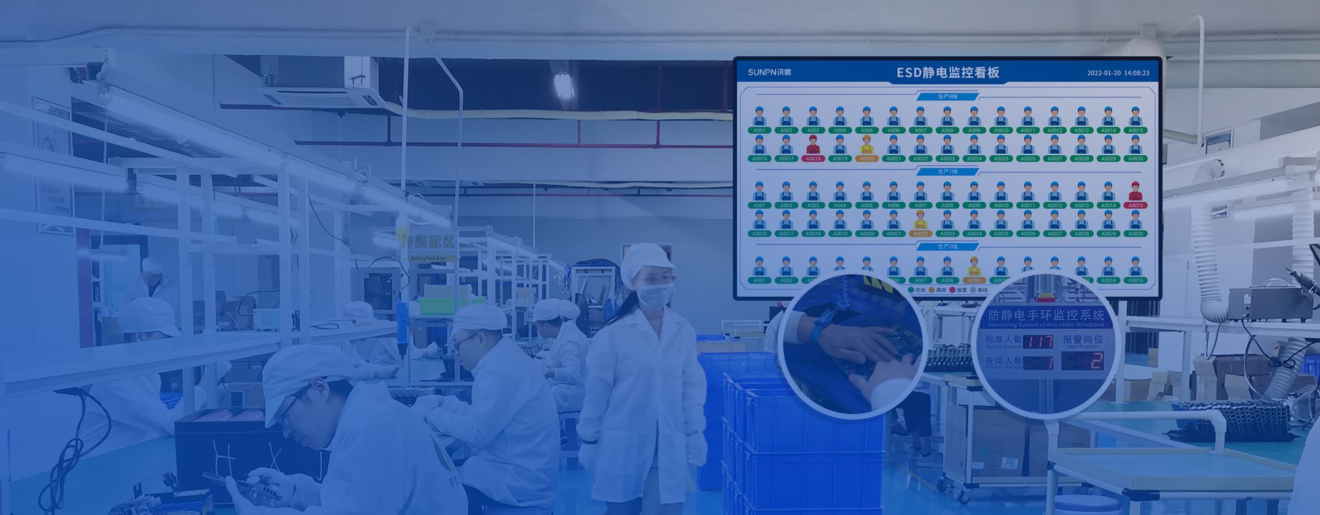 讯鹏科技系统的一站式管理能力,体现在对生产现场全方位、无死角的实时管控。人员在车间工作的防静电仪设备检测,实时监控静电情况,车间生产现场全过程监控 。