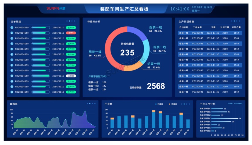 ①根据工单号、时间段、产线等条件查询工单实时的生产情况,包含工单的生产开始时间、完工时间、投入数量、完成数量、不良数量、待维修数量等信息。