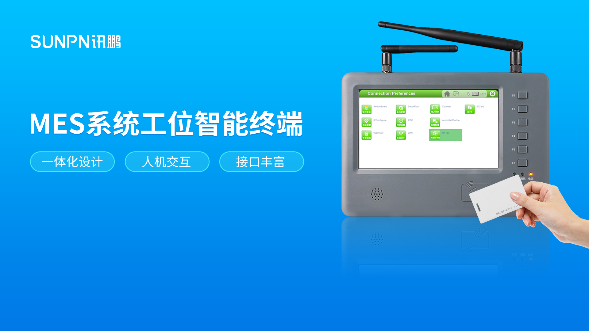 为了解决MES系统软硬结合的难题,讯鹏科技研发了一款应用于生产现场的数字化工业智能终端。产品集显示、交互、数采接口、组网一体化设计,专功能按钮与7寸触摸屏操作结合,加快工序流转,更便利的实现人机信息交互。支持IC/ID读卡报工、喇叭语音提示。集成丰富的输入输出端口,可实现计数、状态告警、输出控制信号。RS485、RS232可扩展外接硬件、传感器等智能设备,RF433、WIFI、以太网实现通讯转换,轻松组网,并具备优异的抗干扰能力。