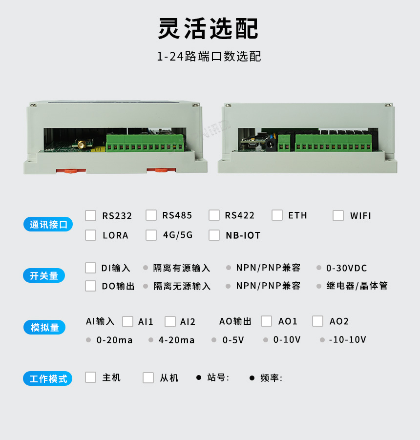 1、上位机读写控制模式,该模式下:客户的主控PLC、PC、上位机组态等可通过该系列产品采集或控制客户现场设备上的开关量、模拟量、传感器等信号,如:光电开关、接近开关、磁性开关、液位、拉压力、0-5v、0-10v、0-20ma、4-20ma、继电器,电磁阀,灯泡,接触器,阀门,电机,报警器等。