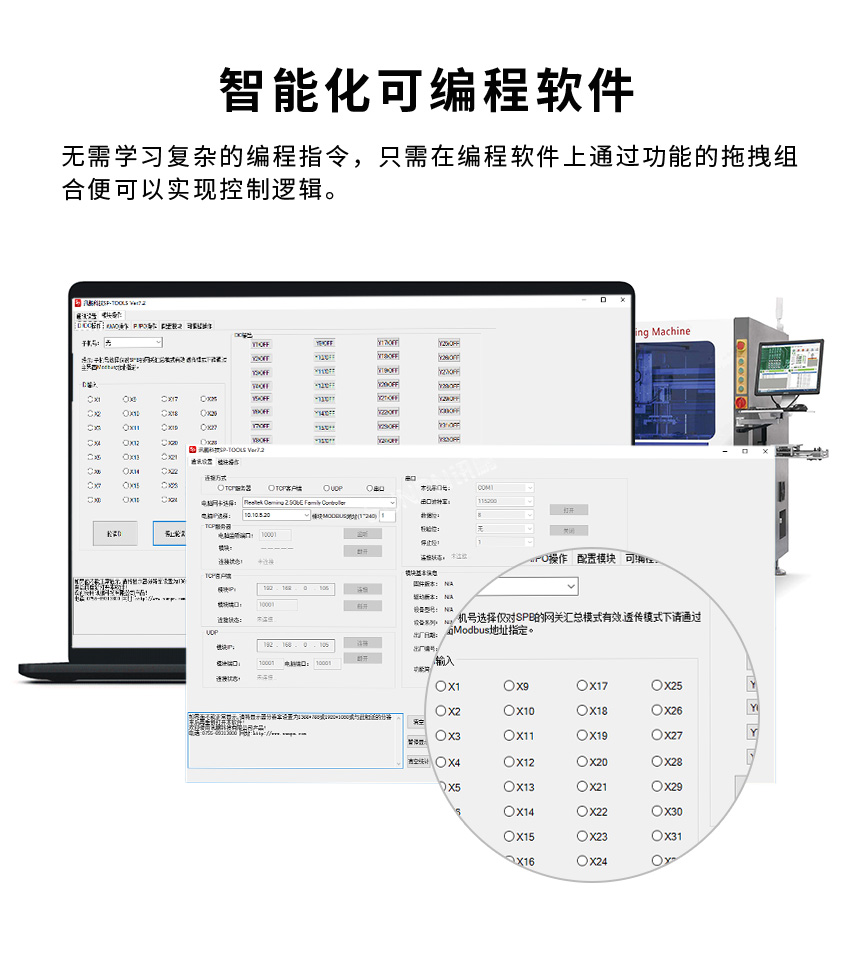 工业IO控制器支持本地逻辑处理运算、自动采集主动上报、Modbus RTUTCP自适应、自动校准阂值上报、组态软件对接、干湿节点IO检测等特色功能,支持连接云平台,实现云端控制;支持一对一、多对一组网,配置软件界面窗口可视化,无需学习复杂的编程指令,只需在编程软件上通过功能的拖拽组合便可以实现控制逻辑。实现用户现场或者远程连接、调试、配置设备。