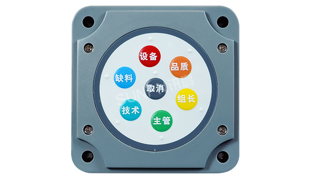 安灯报警按钮盒在安灯系统中是一个重要的工具,每个按钮盒上有不同颜色的按钮,根据软件来定义相应的报警类型,并与相应的灯塔指示灯相对应。当某工位上的工艺或设备发生问题时作业员会按下相应的设备按钮,此时相应设备的报警指示灯亮起闪烁,另外无线主机也会收到此工位的报警信息,将相应的工位状态信息显示在安灯看板上。
