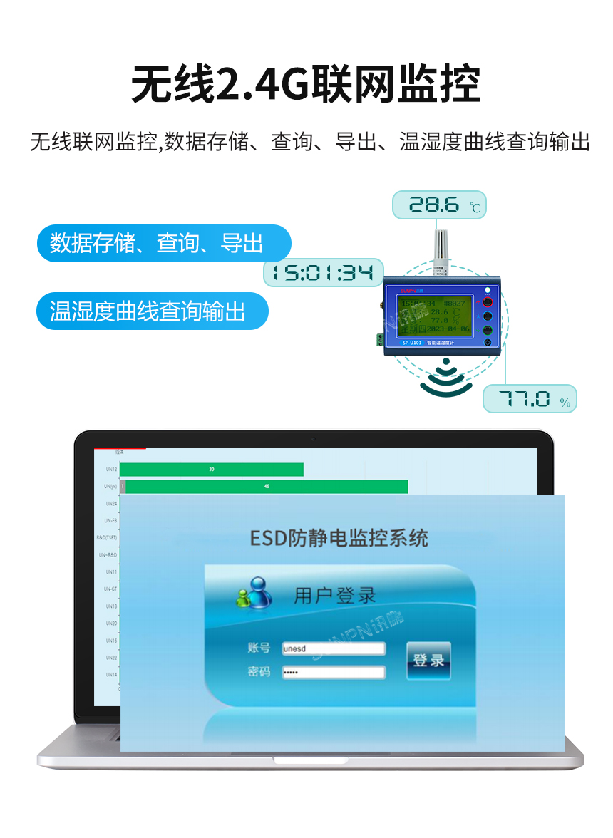 讯鹏SP-U101温湿度监控记录仪是一款具有Zigbee无线传输数据功能的防静电温湿度监控仪。防静电温湿度监控仪集传感技术、计算机技术、通讯技术为一体。防静电温湿度监控仪的使用非常广泛,特别是在电子工业、医药行业、食品行业等领域。这些行业对环境的要求非常高,因为任何微小的变化都可能对产品的质量和安全性产生影响。因此,防静电温湿度监控仪成为了这些行业中必不可少的设备之一。